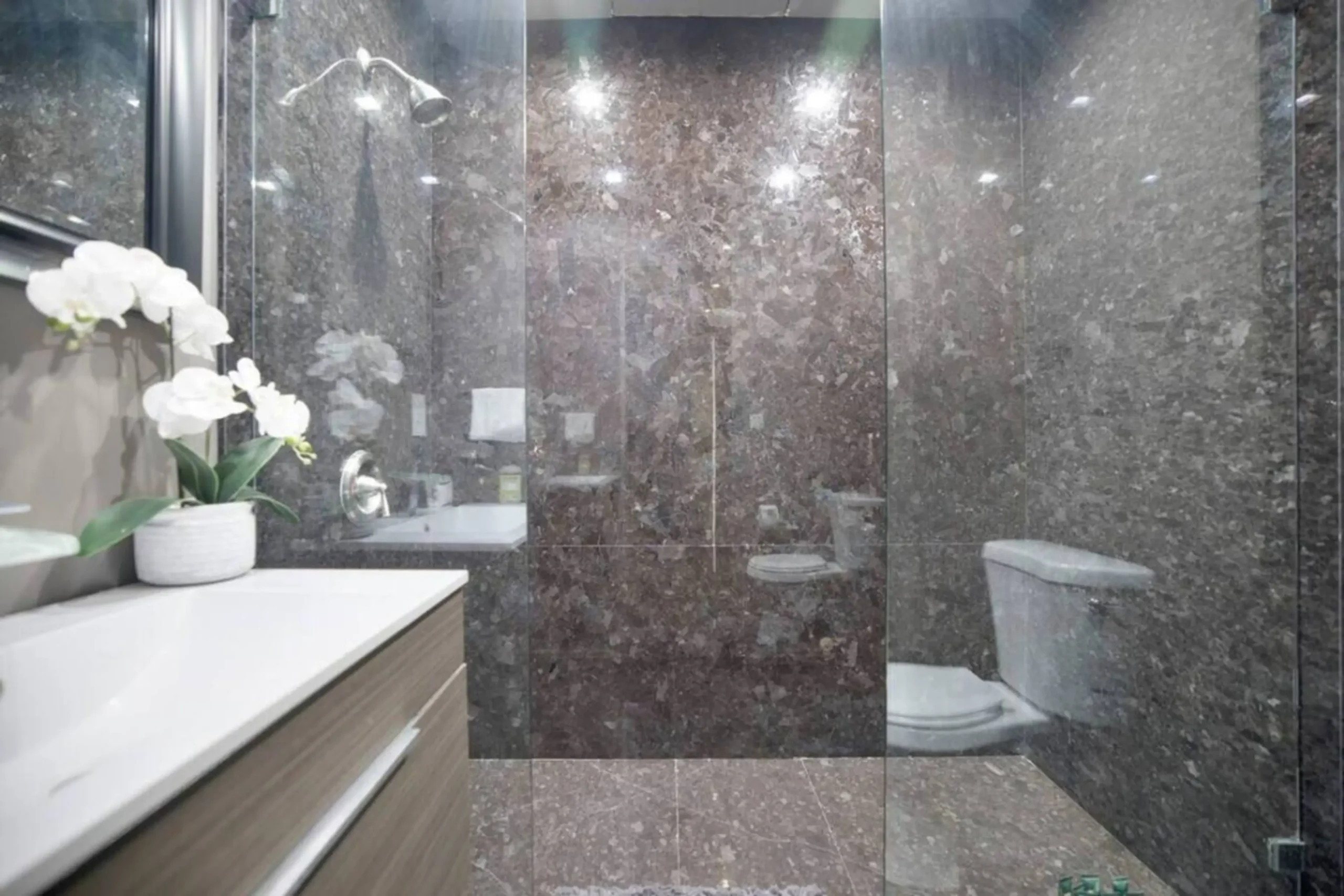 Upstairs, you’ll find five beautifully appointed bedroom suites, each offering comfort, privacy, and elegance. The primary suite is a true sanctuary, featuring dual spa-inspired bathrooms with steam showers and soaking tubs, expansive walk-in closets, a private TV lounge, and 12-foot-high glass doors that open to a balcony with romantic views of city lights, ocean vistas, and Catalina Island.