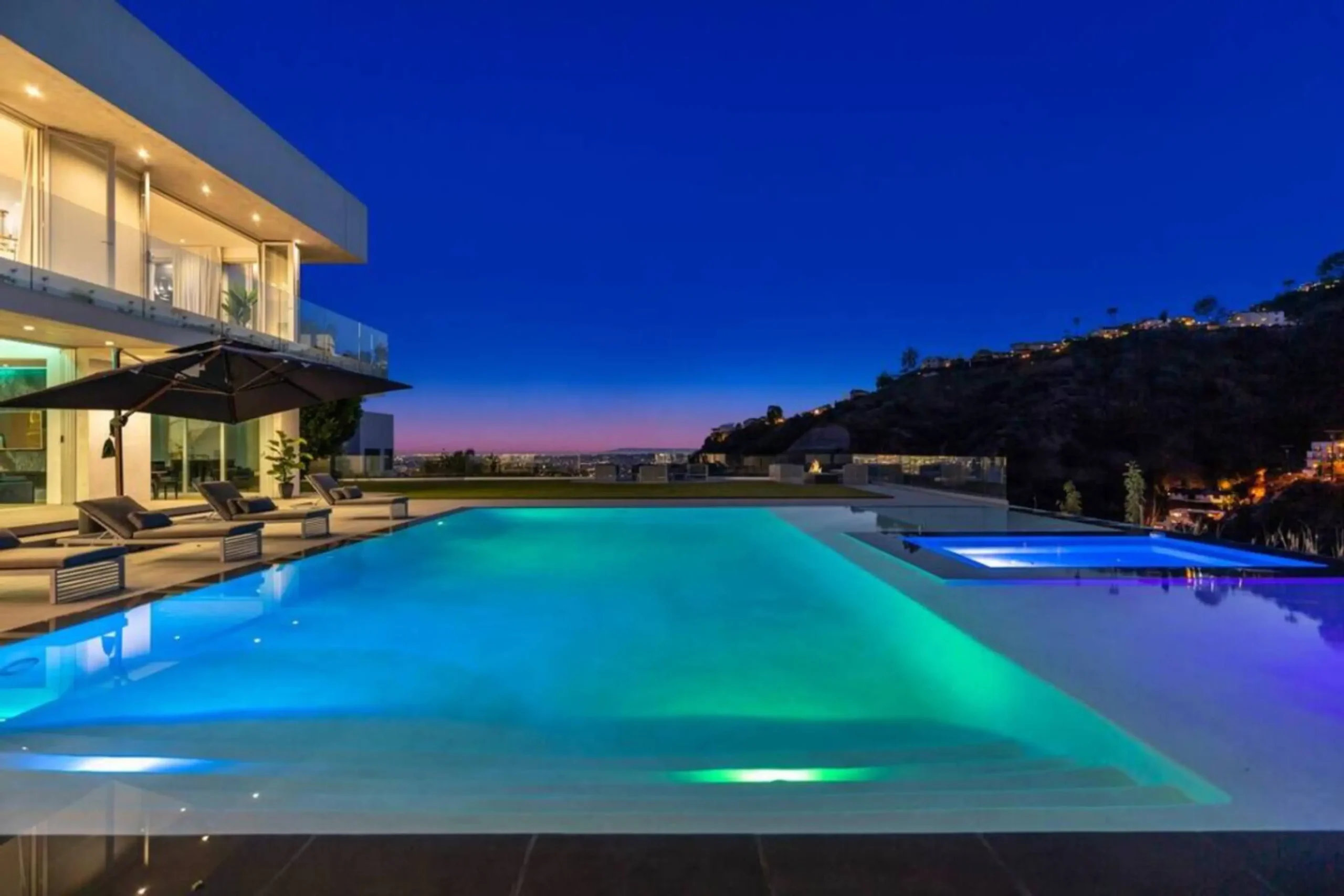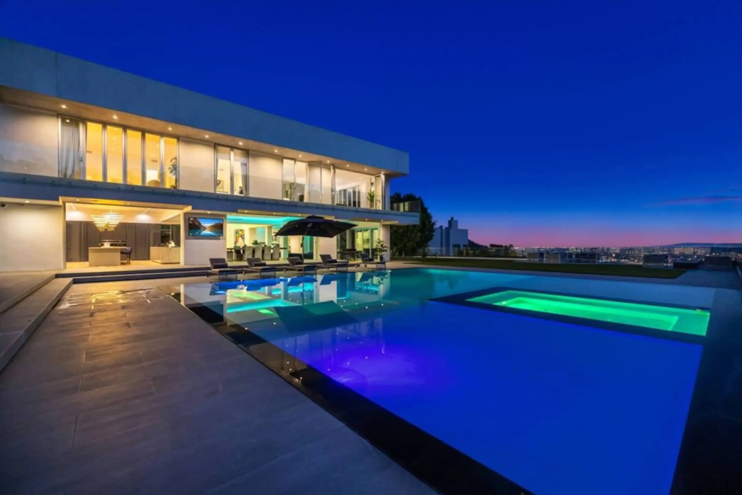 Experience unparalleled luxury in this modern architectural masterpiece, nestled in the prestigious Hollywood Hills. This exceptional residence boasts a striking 35-foot ceiling crowned by a custom glass dome skylight that floods the home with natural light. Sophisticated design elements include custom wall panels illuminated by LED linear multi-color lighting, creating a vibrant and contemporary ambiance throughout.
