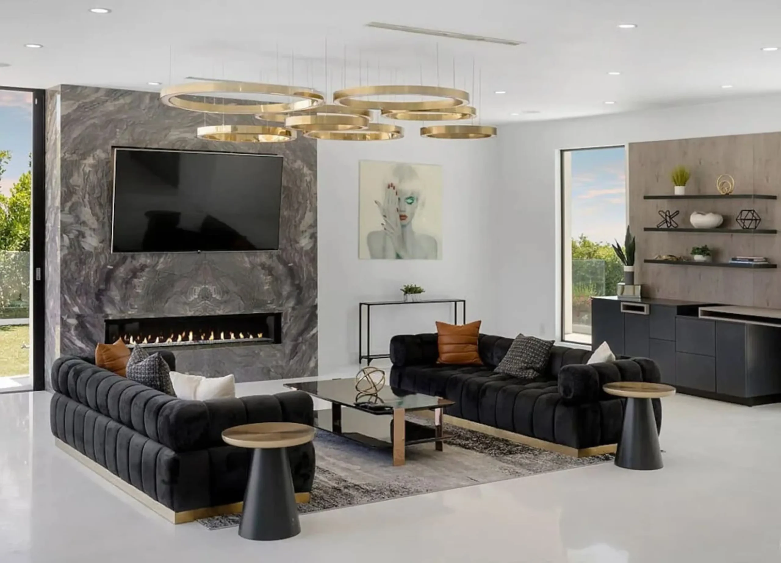 At the heart of the home lies a gourmet chef’s kitchen, thoughtfully designed with a striking center island clad in Calacatta marble, top-of-the-line appliances, and sleek custom cabinetry — ideal for both casual meals and formal hosting.