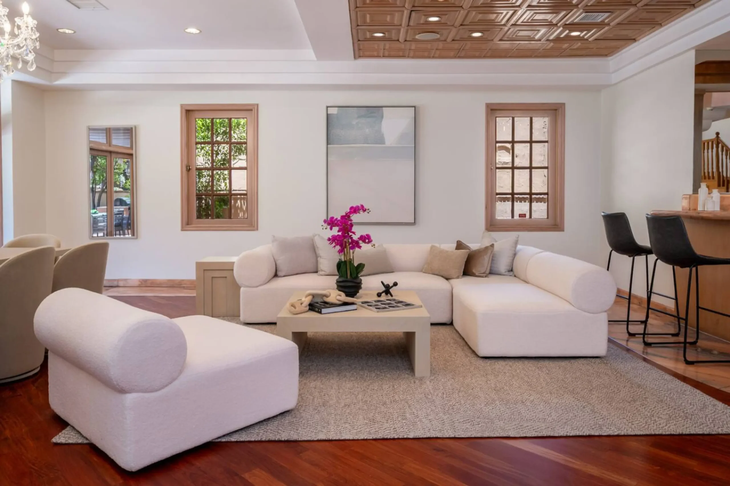 Step into an expansive and beautifully reimagined residence where luxury and comfort blend seamlessly. The grand formal living room immediately impresses with its coffered ceilings, a statement fireplace, and a mirrored wet bar—an ideal space for sophisticated entertaining. The heart of the home, a chef’s dream kitchen, showcases dual JennAir wall ovens, gleaming granite countertops, and a full suite of high-end stainless steel appliances. Exquisite copper-toned cabinetry and matching ceiling detailing add a warm, elegant finish to the space.