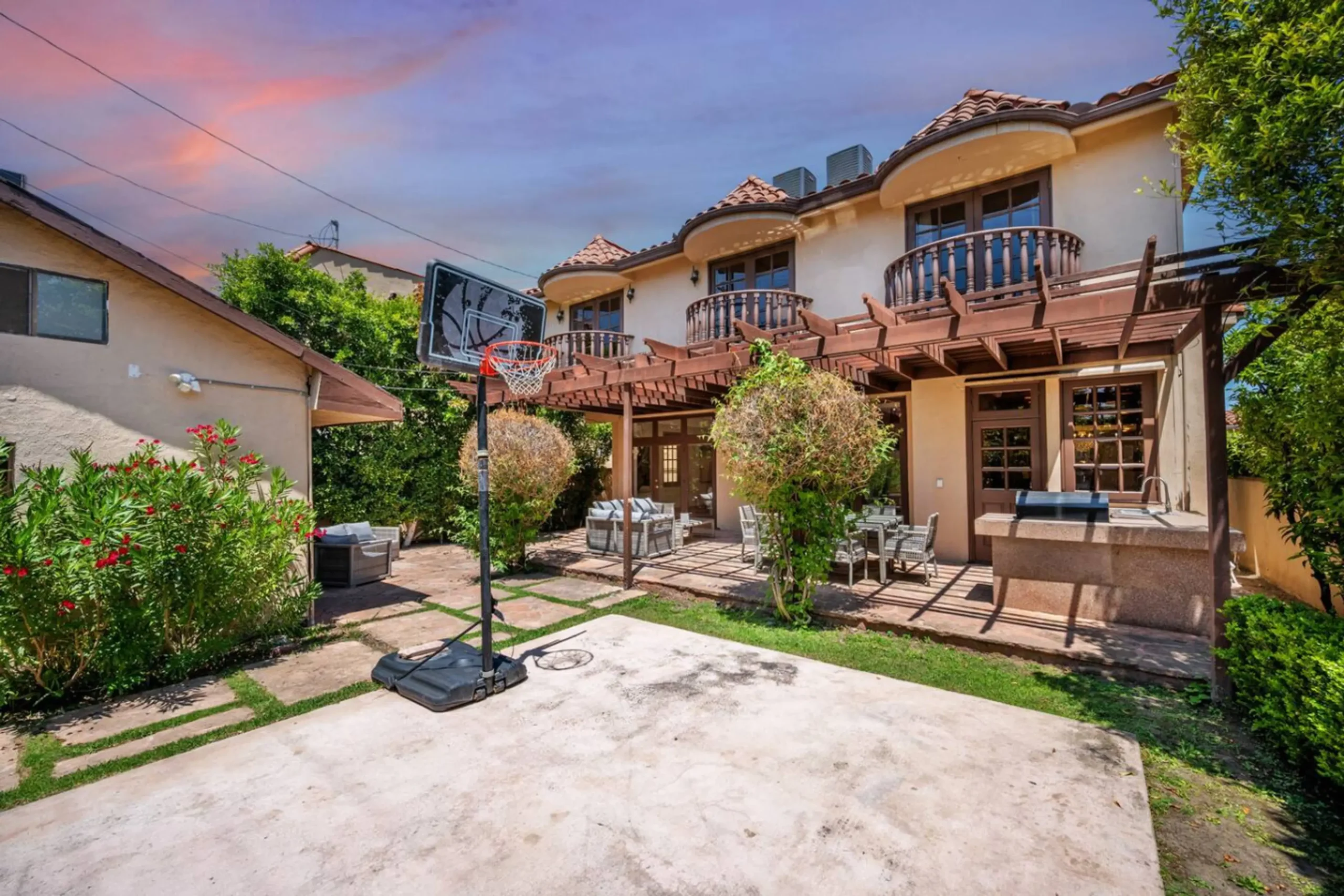 Outdoors, the property transforms into a private oasis. The beautifully hardscaped backyard features a built-in BBQ, sink, and wraparound patio, ideal for al fresco dining or weekend gatherings. Surrounded by mature landscaping and designed for both relaxation and entertaining, this space is a true extension of the home’s indoor luxury.